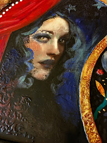 Her narrative mixed media pieces are elegant, textured and storied. And her collection of 'stuff'' is epic - filling drawers and tabletops. Her hero/muse? " Robert Rauschenberg for his love of collage, image transfers and interesting combination of elements; but I am finding many other artists,